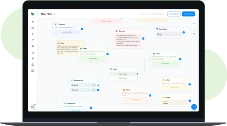 Agora você pode automatizar seu marketing, geração de lead, atendimento e muito mais com um robô. Em uma tarde você constrói o seu utilizando o nosso construtor arrasta e solta.